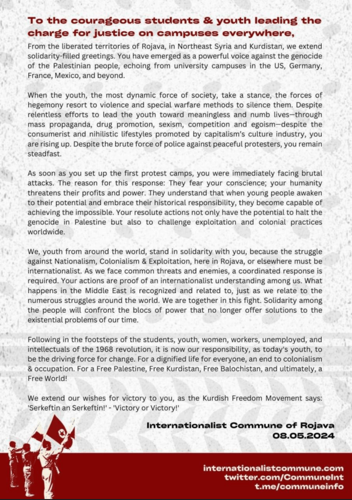 Dai territori liberati del Rojava, nel nord est della Siria e in Kurdistan, mandiamo i nostri saluti solidali. Siete emersi come una voce potente contro il genocidio del popolo palestinese dai campus in USA, Germania, Francia, Messico e in molti altri paesi.