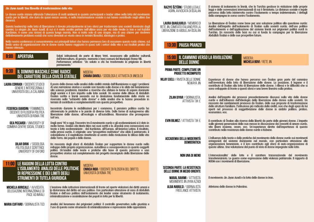 La conferenza, che riunirà accademiche e attiviste italiane e curde di diversa provenienza professionale, durerà un giorno. Il programma, che prevede quattro sessioni in totale, è il seguente:
